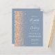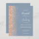 The left-hand edge of this elegant modern wedding invitation features a peach faux glitter border. The customisable text combines white handwriting, copperplate and italic fonts on a dusty blue background. The reverse side provides space for wedding details on a solid dusty blue background, along with a QR code guests can scan to visit your website and RSVP, which saves the cost of printing and mailing separate RSVP cards.