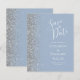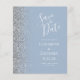 The left-hand edge of this elegant modern wedding save the date card features a silver faux glitter border. The customisable text combines white handwriting and copperplate fonts on a dusty blue background. The reverse side features a matching dusty blue and silver design.