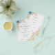 Elegant calligraphy wedding invitation with a dusty blue wildflower surrounded by wild green and pink foliage. Simple, beautiful dusty blue script that can be easily edited with your information.