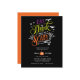Featuring the words "Eat, Drink, and Be Scary" in a purple, orange, lime green colour scheme and retro typography style and adorned with bats, moon, nets and a little spider these Halloween party invitations are perfect to invite your friends and family!