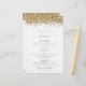 Budget Elegant Gold Glitter Script Wedding Menu. A budget price size 5.5” x 8.5”, A stylish script with swashes for the header Menu and a faux glitter border at the top on both sides in gold. Easily personalise the rest of the text to your own details which includes alternatives for your vegan or vegetarian options.