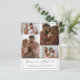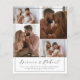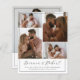 A minimalist photo wedding invitation featuring elegant script calligraphy names and classic typography with 5 photos. The front of the budget cards features a 4 photo collage and the back has one big photo. The 4 photo grid features two portrait vertical photos and two landscape horizontal pictures. The couple's names are written underneath in chic script lettering, with the invitation text and the date of the wedding. We have chosen to show only the basic information on the front of the card while showcasing 4 of your favourite engagement photos so these cards can be used as cherished keepsakes or save-the-dates. We have chosen template photos of a couple sitting at home in a boho colour palette, but you can use any photos you would like - photos from holidays, selfies, proposal photos, or the images from an engagement photoshoot. Cards reverse to a big picture of your choice with the rest of the event details below in minimalist serif typography. This simple and elegant invitation is perfect for a modern wedding. The minimal, versatile design is suitable for any season or wedding theme. We have chosen a timeless black-and-white colour combination for this design to be sure it matches your photos, but you can change any of the colours using Zazzle's design tool. To get started, click on "Personalise" and create your own unique wedding invitations. As part of the budget selection on Zazzle, this sheet isn't a standard invite size or paper quality. If you want this design on an invitation card you can find it in our store or use the Zazzle Make Machine to transfer it onto the product of your choice. There is a second version of this design available in our store or in the collection featured on this page. Don't hesitate to contact me with any questions or custom order requests - I'll be happy to help!