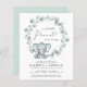 Budget-friendly gender-neutral couples baby sprinkle invitation featuring "A Sweet Little Peanut Is On Its Way" in a mix of modern typography and a stylish script with a heart swash, and a watercolor of a cute pastel mint green baby elephant in a wreath of sage green eucalyptus greenery. Add the names of the parents-to-be and the sprinkle details in simple typography.