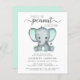 A cute and budget-friendly gender-neutral baby sprinkle shower invitation featuring "A Sweet Little Peanut Is On Its Way" (change to "his" or "Her" way if desired) written in a mixture of soft grey typography and stylish script, and a pastel mint green watercolor of a baby elephant. Personalise the mother's name and shower details in simple grey typography.