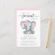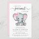 A cute budget-friendly baby girl shower invitation with "A Sweet Little Peanut Is On Her Way" written in soft grey modern typography and stylish script, and a pastel pink watercolor of a baby girl elephant. Personalise the mother's name and shower details in simple grey typography.