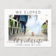 Budget-friendly elopement or smaller wedding announcement to let family and friends that you eloped or reduced the number of guests at your wedding to a small intimate group, and to invite them to a wedding reception or celebration party. The front features your photo and "We Eloped Let's Celebrate" in a mix of simple typography and trendy script, and your first names and wedding date. On the reverse you can personalise your message and invitation in more detail and your names in a signature-like script.