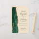 The left-hand edge of this elegant modern wedding invitation features an emerald green watercolor agate border trimmed with faux gold glitter. The customizable text combines green handwriting, copperplate and italic fonts on a champagne beige background. Add additional details on the back, along with a QR code to help your guests visit your wedding website.