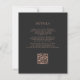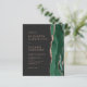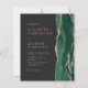 The right edge of this elegant modern wedding invitation features an emerald green watercolor agate border trimmed with faux rose gold glitter. The customisable text combines dusty rose pink serif, copperplate and italic fonts on a slate black background. The reverse side provides space for wedding details on a solid slate black background, along with a QR code guests can scan to visit your website and RSVP, which saves the cost of printing and mailing separate RSVP cards.
