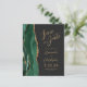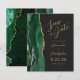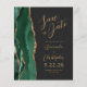 The left-hand edge of this elegant modern wedding save the date card features an emerald green watercolor agate border trimmed with faux gold glitter. The customisable text combines gold-coloured script and sans serif fonts on a slate black background. The reverse side features a matching green and gold agate design.