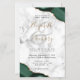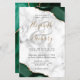 An emerald green watercolor agate design trimmed with faux gold glitter appears in two corners of this elegant design. Personalize it with the couple's names in gold-colored handwriting script over a large gray ampersand. Add the wedding details in black copperplate and italic fonts on a gray and white marble background. The reverse side features a matching green and gold agate design.
