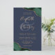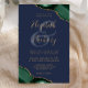 An emerald green watercolor agate design trimmed with faux gold glitter appears in two corners of this elegant design. Personalize it with the couple's names in gold-colored handwriting script over a large blue ampersand. Add the wedding details in gold-colored copperplate and italic fonts on a navy blue background. The reverse side features a matching green and gold agate design.