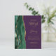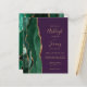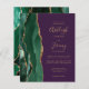 The left-hand edge of this elegant modern wedding invitation features an emerald green watercolor agate border trimmed with faux gold glitter. The customisable text combines gold-coloured handwriting, copperplate and italic fonts on a purple background. The reverse side features a matching emerald green and gold agate design.