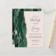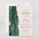 The left-hand edge of this elegant modern wedding invitation features an emerald green watercolor agate border trimmed with faux rose gold glitter. The customisable text combines charcoal grey handwriting, copperplate and italic fonts on a blush pink background. The reverse side features a matching emerald green and rose gold agate design.