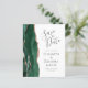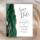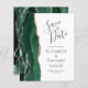The left-hand edge of this elegant modern wedding save the date card features an emerald green watercolor agate border trimmed with faux rose gold glitter. The customisable text combines charcoal grey handwriting, copperplate and italic fonts on a white background. The reverse side features a matching emerald green and rose gold agate design.