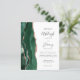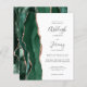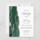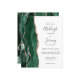 The left-hand edge of this elegant modern wedding invitation features an emerald green watercolor agate border trimmed with faux rose gold glitter. The customisable text combines charcoal grey handwriting, copperplate and italic fonts on a white background. The reverse side features a matching emerald green and rose gold agate design.