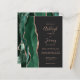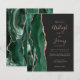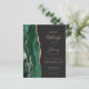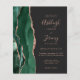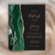 The left-hand edge of this elegant modern wedding invitation features an emerald green watercolor agate border trimmed with faux rose gold glitter. The customisable text combines rose pink handwriting, copperplate and italic fonts on a sable black background. The reverse side features a matching emerald green and rose gold agate design.