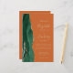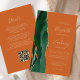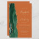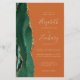 The left-hand edge of this elegant modern wedding invitation features an emerald green watercolor agate border trimmed with faux gold glitter. The customisable text combines gold-coloured handwriting, copperplate and italic fonts on a burnt orange or rust background. Add additional details on the back, along with a QR code to help your guests visit your wedding website.