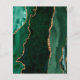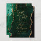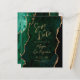 This elegant wedding save the date card features a background image of emerald green watercolor agate trimmed with faux gold glitter. The customisable text combines gold-coloured modern handwriting, copperplate and italic fonts. The reverse side features a coordinating emerald green and gold agate design.