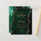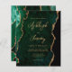 This elegant wedding invitation features a background image of emerald green watercolor agate trimmed with faux gold glitter. The customisable text combines gold-coloured modern handwriting, copperplate and italic fonts. The reverse side features a coordinating emerald green and gold agate design.