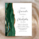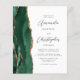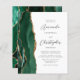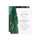 The left-hand edge of this elegant modern wedding invitation features an emerald green watercolor agate border trimmed with faux gold glitter. The customizable text combines charcoal gray script and sans serif fonts on a white background. The reverse side features a matching emerald green and gold agate design.