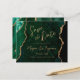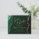 This elegant wedding save the date card features a background image of emerald green watercolor agate trimmed with faux gold glitter. The customisable text combines gold-coloured modern handwriting, copperplate and italic fonts. The reverse side features a coordinating emerald green and gold agate design.
