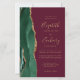 The left-hand edge of this elegant modern wedding invitation features an emerald green watercolor agate border trimmed with faux gold glitter. The customizable text combines gold-colored handwriting, copperplate and italic fonts on a burgundy red background. The reverse side features a matching emerald green and gold agate design.