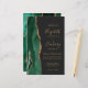 The left-hand edge of this elegant modern wedding invitation features an emerald green watercolor agate border trimmed with faux gold glitter. The customisable text combines gold-coloured handwriting, copperplate and italic fonts on an off-black background. The reverse side features a matching emerald green and gold agate design.