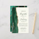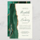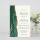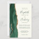 The left-hand edge of this elegant modern wedding invitation features an emerald green watercolor agate border trimmed with faux gold glitter. The customizable text combines green handwriting, copperplate and italic fonts on an ivory background. The reverse side features a matching emerald green and gold agate design.