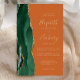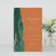 The left-hand edge of this elegant modern wedding invitation features an emerald green watercolor agate border trimmed with faux gold glitter. The customizable text combines gold-colored handwriting, copperplate and italic fonts on a burnt orange or rust background. The reverse side features a matching emerald green and gold agate design.