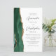 The left-hand edge of this elegant modern wedding invitation features an emerald green watercolor agate border trimmed with faux gold glitter. The customizable text combines charcoal gray script and sans serif fonts on a white background. A matching emerald green agate design appears on the back of the card.