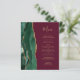 The left-hand edge of this elegant modern wedding menu features an emerald green watercolor agate border trimmed with faux gold glitter. The customisable text combines gold-coloured whimsical handwriting script and copperplate fonts on a burgundy red background. The reverse side features a matching emerald green and gold agate design.