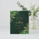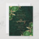 This elegant wedding invitation features green floral bouquets set off with gold faux foil greenery in two corners, on a background image of emerald green watercolor agate. The customisable text combines gold-coloured serif, italic and handwriting fonts. The reverse side provides space for wedding details on a green agate background, along with a QR code guests can scan to visit your website and RSVP.
