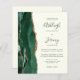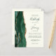 Save the cost of printing and mailing separate RSVP cards with this elegant modern all-in-one budget wedding invitation. The left-hand edge features an emerald green watercolor agate border trimmed with gold faux glitter. The customisable text combines green handwriting, copperplate and italic fonts on an ivory background. The reverse side provides space for wedding details on a solid ivory background, along with a QR code guests can scan to visit your website and RSVP.
