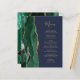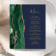 The left-hand edge of this elegant modern wedding menu features an emerald green watercolor agate border trimmed with faux gold glitter. The customisable text combines gold-coloured whimsical handwriting script and copperplate fonts on a navy blue background. The reverse side features a matching emerald green and gold agate design.