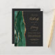 Save the cost of printing and mailing separate RSVP cards with this elegant modern all-in-one budget wedding invitation. The left-hand edge features an emerald green watercolor agate border trimmed with gold faux glitter. The customisable text combines gold-coloured handwriting, copperplate and italic fonts on a slate black background. The reverse side provides space for wedding details on a solid slate black background, along with a QR code guests can scan to visit your website and RSVP.