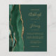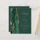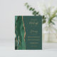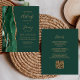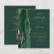 Save the cost of printing and mailing separate RSVP cards with this elegant modern all-in-one budget wedding invitation. The left-hand edge features an emerald green watercolor agate border trimmed with gold faux glitter. The customisable text combines gold-coloured handwriting, copperplate and italic fonts on a green background. The reverse side provides space for wedding details on a solid green background, along with a QR code guests can scan to visit your website and RSVP.
