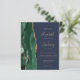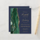 The left-hand edge of this elegant modern wedding invitation features an emerald green watercolor agate border trimmed with faux gold glitter. The customizable text combines gold-colored handwriting, copperplate and italic fonts on a navy blue background. The reverse side provides spaces for 4 photos (1 square, 2 horizontal, 1 long vertical) and room for your wedding website URL or other information.