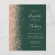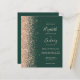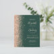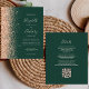 The left-hand edge of this elegant modern wedding invitation features a peach faux glitter border. The customisable text combines peach handwriting, copperplate and italic fonts on an emerald green background. The reverse side provides space for wedding details on a solid green background, along with a QR code guests can scan to visit your website and RSVP, which saves the cost of printing and mailing separate RSVP cards.