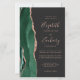 The left-hand edge of this elegant modern wedding invitation features an emerald green watercolor agate border trimmed with faux rose gold glitter. The customizable text combines rose pink handwriting, copperplate and italic fonts on an off-black background. The reverse side features a matching emerald green and rose gold agate design.