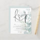 Eucalyptus Elegant Script Wedding RSVP. A budget price paper alternative. Envelopes are an optional extra. A stylish set typography in black for the main heading RSVP complementing the rest of the text which you can easily personalise. Blue eucalyptus leaves are tinted into the background with the text partially overlaid on top. A coordinating powder blue background is also on the back.