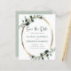 Budget Eucalyptus Gold Metallic Wedding Save the Date Invitation... Our luxe botanical Save the Date invitation features a gold metallic oval frame embellished with dusty green and emerald-hued eucalyptus leaves creating a natural looking border for the announcement text within. The dusty green back of the card contains your wedding website information and a QR code graphic template you can replace with your own code graphic. All example text (except for the Save the Date graphic) can be easily revised with your own details on the personalisation template.