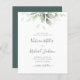 Beautiful affordable Save the date card featuring watercolor eucalyptus and gold leaves with modern handwritten script.