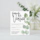 Eucalyptus Leaves Script Virtual Wedding. A budget price SMALLER 4.5” x 5.6” alternative. Available in a SEMI-GLOSS 110 lb CARD STOCK which is the default option (thicker for invitations), OR a SATIN FINISH 80 lb THINNER PAPER STOCK (ideal for enclosures). Envelopes are an optional extra and are slightly larger than the card size. If current circumstances mean that social distancing is essential and for those times when you wish to share your vows with those who live too far away to join you in person, a virtual ceremony via live streaming is the next best thing. This minimal yet stylish design has a single eucalyptus branch running the length of the right hand side, with an informal set script for the header Going Virtual. The rest of the text can be easily personalised to your own details. You can also change the font style and colour of the editable text if you wish via the Customise Further option, as well as the background colours on the front and back. You may also consider the guest individual name and address labels available in this collection to make lighter work of your wedding mailings.