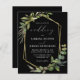 This elegant rustic wedding invitation features a gold faux foil geometric frame decorated with eucalyptus and olive greenery on a black background. The word "wedding" appears in calligraphic script. Customise the white text with the names of the bride and groom and the wedding details on the front, and their initials and website URL on the reverse.