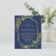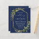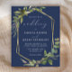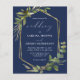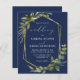 This elegant rustic wedding invitation features a gold faux foil geometric frame decorated with eucalyptus and olive greenery on a navy blue background. The word "wedding" appears in calligraphic script. Customize the white text with the names of the bride and groom and the wedding details on the front, and their initials and website URL on the reverse.