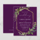 This elegant rustic wedding invitation features a gold faux foil geometric frame decorated with eucalyptus and olive greenery on a deep eggplant purple background. The word "wedding" appears in calligraphic script. Customise the white text with the names of the bride and groom and the wedding details on the front, and their initials and website URL on the reverse.