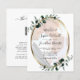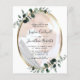 Budget Eucalyptus Photo All in One QR Code RSVP Gold Wedding Invitation... Our affordable "QR Code RSVP" photo botanical wedding invitation features a gold metallic oval frame embellished with sage and emerald green eucalyptus leaves bordering a photo of the bride and groom on a crisp white background. Your photo will be placed on a layer underneath a white transparency to "fade" the colours somewhat so the text on top is readable. The back of the invitation also displays your wedding website QR code as well as the website's URL itself allowing your invitees to easily RSVP online and view all of the details normally sent in a wedding packet. This modern style wedding invitation was designed to be both elegant and budget conscious... not to mention time-saving. All example text can be easily revised with your own information on the personalisation template. PLEASE NOTE: Budget cards do not automatically come with envelopes, as do the traditional invitation cards, but you can purchase them on the same page at checkout if you wish. This all in one QR code RSVP design is also available on a traditional 5x7 wedding invitation.