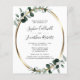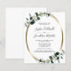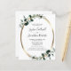 Budget Eucalyptus All in One Website RSVP Gold Metallic Wedding Invitation... Our "All in One" luxe botanical wedding invitation features a gold metallic oval frame embellished with emerald-hued eucalyptus leaves bordering your personalised wedding invitation text. The front of the invitation also includes the wedding website where your invitees can RSVP and view all of the details normally sent in a wedding packet. This modern style wedding invitation was designed to be both elegant and budget conscious... not to mention time-saving. All example text can be easily revised with your own information on the personalisation template.