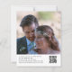 Budget Eucalyptus Wedding Photo QR Code Thank You. A budget price SMALLER 4.5” x 5.6” alternative. Available in a SEMI-GLOSS 110 lb CARD STOCK which is the default option (thicker for invitations), OR a SATIN FINISH 80 lb THINNER PAPER STOCK (ideal for enclosures). Add your QR code to your wedding photo gallery on the back by replacing the QR code on the sample. You can create QR codes for free online. Simply search “QR code creator” and lots of options come up to create for free. The header is set in a modern handwriting style script with the details beneath. A branch of watercolor eucalyptus leaves runs across the top. Easily personalise the text to your own details and replace the sample photo on the back with your own.