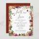 This is a budget friendly rustic and elegant bridal shower invitation, using a modern watercolor autumnal floral and foliage design and the text "Fall in Love" in a feminine handwritten script. The colour palette features rich fall colours such as burgundy, burnt orange, terracotta, deep green, berry and gold.